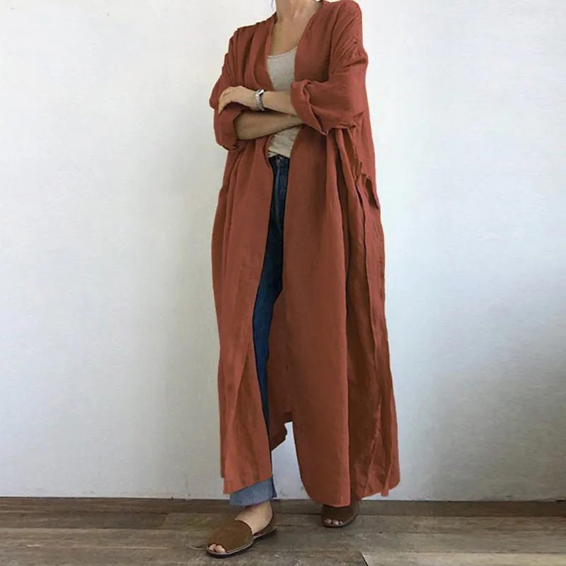 Autumn Solid Shirt Loose Tunic Top Lace up Blouse Fashion Women Long Sleeve Open Front Cotton Linen Coat Vintage Long Cardigan